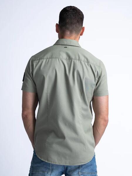 Camisa Manga Corta Petrol Industries Regular Fit Verde Caqui Confeccionada en Puro Algodón con Cierre de Botones. Cuello Clásico. Diseño de Estilo Militar con Detalle de Parches y Logotipo Bordado en el Pecho. Bolsos Frontales con Solapas y Cierre de Botón. Canesú Dorsal Recto. Bajo con Corte Ondulado.