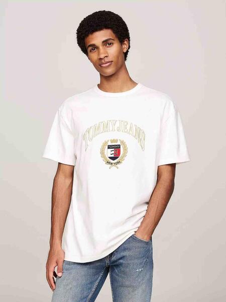 Camiseta Tommy Regular Fit Beige Confeccionada en Puro Algodón con Escudo de Tommy Jeans Biordado en el Pecho. Cuello Redondo. Manga Corta. Detalles Distintivos de Tommy Jeans. Patronaje Amplio y Holgado, Ligeramente Caido de Hombros. Perfecta para Looks de Entretiempo, esta Camiseta de Cuello Redondo Confeccionada en Algodón cuenta con un Diseño de Escudo y Detalles Distintivos que le Confieren un Acabado Llamativo. Este Producto Contiene Algodón de Transición, con Certificado Independiente que Ayuda a los Agricultores a Pasarse a la Agricultura Orgánica Durante un Periodo de Tres años. El Algodón Crece sin Pesticidas Químicos, Fertilizantes Químicos ni Semillas Genéticamente Modificadas.