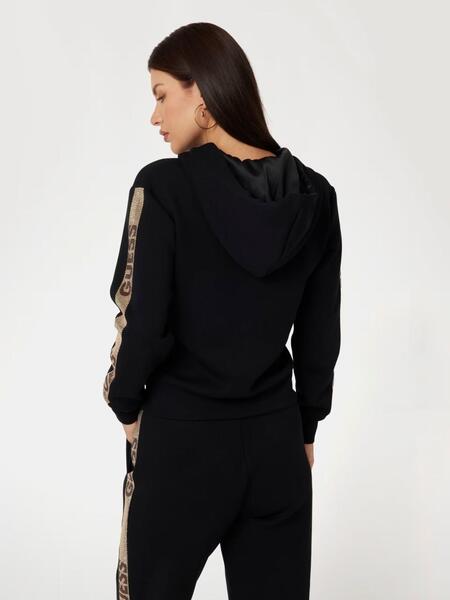 Sudadera con Capucha Guess Studs Logo Regular Fit Negra Confeccionada en Suave Neopreno Elástico Mezcla de Viscosa con Logo Lateral de Guess en las Mangas Realizado en Strass Dorado y Marrón. Cierre Frontal con Cremallera Dorada. Cuello Redondo. Capucha Ajustable con Cordones Anchos. Bolso Canguro. Bajo y Puños Elásticos. La Prenda de la Imagen es una Talla S. Longitud Total: 57 cm / 22,4 in. Longitud de las Mangas: 60 cm / 23,6 in.