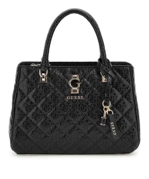 Bolso Guess Bessey Luxury Satchel Confeccionado en Suave Ecopiel Negra Efecto Charol con Estampado Integral del Logotipo 4G. Cierre de Cremallera. Piezas Metálicas de Color Dorado Pálido. Logotipo de Guess Metálico Dorado. Tres Compartimentos Interiores, Monedero Central y Laterales con Ranuras para Tarjetas de Crédito y Bolsillo con Cremallera. Forro Interior en Suave Poliéster Beige con Logos de Guess. Dos Asas Cortas de 45 cm de Longitud Aprox. Correa con Cadena Trenzada de 110/130 cm para Llevarlo como Bandolera en el Mismo Material. Medidas 28 cm x 20 cm x 10 cm.