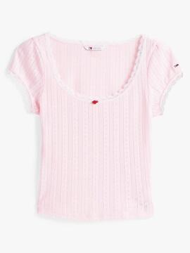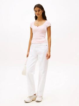 Camiseta Lencera Tommy Jeans Slim Fit Rosa Confeccionada en Suave Algodón Elástico Acanalado. Escote Redondo Ribeteado con Blonda con Detalle de Rosa. Manga Corta. Mangas y Bajo con Volantes. Parche con el Logo de Tommy Jeans en la Manga. Esta Camiseta con Textura Acanalada, Ideal para Combinar con Looks Informales, se Caracteriza por el Favorecedor Corte Slim y las Mangas y el Bajo con Volantes. Esta Camiseta está Confeccionada con Algodón Regenerativo, Salvo los Adornos. El Algodón se Cultiva con Métodos que Tratan de Mejorar la Salud del Suelo, las Cuencas y la Biodiversidad.