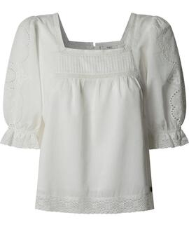 Blusa Pepe Jeans Everly Regular Fit Confeccionada en Suave Tejido Voile 100% Algodón con Cierre Abotonado Dorsal. Escote Cuadrado con Detalles Plisados en el Pecho. Manga Francesa Abullonada con Detalles Bordados a Tono. Puños Elásticos con Detalle de Volantes. Placa Metálica Circular con Logo PEPEJEANS en Bajo.
