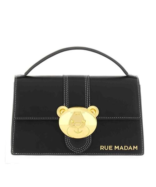 Bolso de Mano Rue Madam Paris Teddy It Bag Confeccionado en Suave Ecopiel Lisa Negra con Cierre de Solapa con Botón Magnético. Logo de Osito e Inscripción en Relieve de Rue Madam Paris Realizados en Acabado Metálico Dorado. Asa Corta de 25 cm y Correa Larga Ajustable y Desmontable de 120 cm para Llevarlo como Bandolera. Un Compartimento Interior con Bolsillo con Cierre de Cremallera en un Lateral y Bolso de Acceso Directo en el Lateral Opuesto. Forro Interior en Suave Algodón a Tono. Medidas 25cm X 14.5cm X 7,5cm.