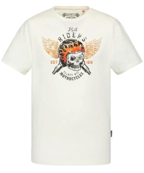 Camiseta Schott NYC® Tsbedford Regular Fit Confeccionada en Puro Algodón Vigoré Color Crudo con Estampado Hell Rider Vintage Frontal Inspirado en la Cultura Motociclista. Cuello Redondo. Manga Corta. Bajo Recto. El Vigoré es un Tejido Jaspeado que Suele Utilizarse con Fibras de Diversos Colores para Conseguir que la Prenda Elegida no Tenga un Matiz Plano, sino Dotarlo de Intensidades más Sutiles o Marcadas.