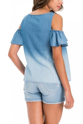 Camiseta Salsa en Denim Azul Degradé de Hombros al Aire.