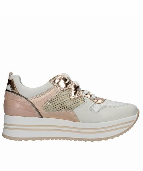 Sneakers NeroGiardini E010567D de Piel Blanca y Oro Rosa Combinados con Malla Textil Blanca y Beige. Talonera en Piel Coco Nude. Forro Interior de Piel. Altura de Suela en el Talón 4,5 cm. Altura Total 12,5 cm. Sistema de Secado Rápido DryGo®, Espuma Especial que Absorve la Humedad en el Zapato Ofreciendo una Agradable Sensación de Sequedad y de Bienestar (BASF). SE RECOMIENDA ESCOGER UNA TALLA MENOR A LA HABITUAL.