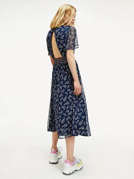 Vestido Tommy TJW Open Back Dress Regular Fit de Gasa Azul Marino con Estampado de Cachemir Beige. Corte Evasé. Forro Interior Azul Marino. Cuello de Pico Pronunciado. Manga con Volantes con Efecto de Transparencia. Cintura Fruncida con Costura Elástica Bicolor. Cierre Posterior con Botón. Espalda Abierta.