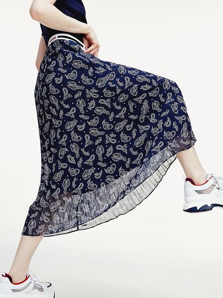 Falda Plisada Tommy TJW Pleated Midi Skirt de Gasa Azul Marino con Estampado de Cachemir Beige. Forro Interior Azul Marino. Cintura Elástica con Logo Bordado.