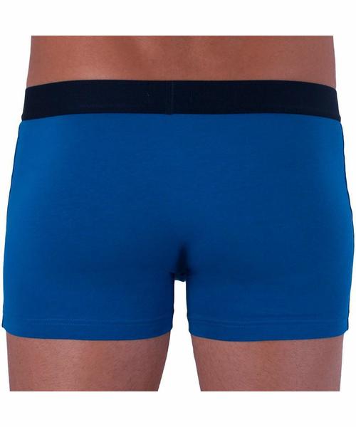 Boxers Tommy 2 Pack Trunk Confeccionados en Algodón Elástico con Cintura Elástica al Contraste. Uno Azul Royal Liso y el otro Azul Marino con Estampado de Texto Multicolor.