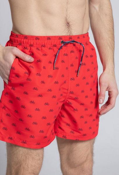 Bañador Valecuatro 3288 Rojo con Estampado de Bicicletas en Color Azul Marino. Confeccionado con Material Textil de Secado Rápido. Forro Interior de Malla Blanca con Cinturilla Elástica al Contraste. Cordones Personalizados. Bolsos Laterales. Bolso Trasero con Parche en la Tapeta, Tirador y Cierre de Velcro. Ojal de Desague en el Bolsillo Trasero que Facilita su Posterior Secado. Escudo Engomado en el Bajo de la Pierna Izquierda.