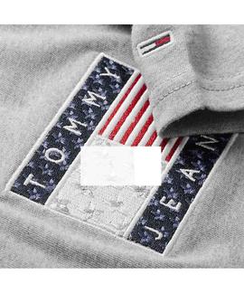 Camiseta Tommy TJW Star Americana Flag Cropped Fit Gris Realizada con Algodón Orgánico. Parche de Bandera Bordada Frontal con Lúrex Inspirado en la Bandera de los Estados Unidos. Manga Corta. Cuello Redondo. Un Look Deportivo con un Fit Extra Ancho y Corto.