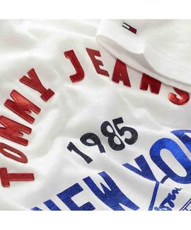 Camiseta Tommy TJM Circle New York Tee Regular Fit Blanca Realizada con Mezcla de 60% Algodón Orgánico y 40% Modal. Logo Frontal Circular Estampado Multicolor con Acabado Metalizado. Cuello Redondo. Manga Corta.