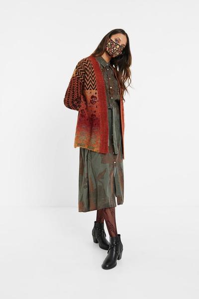 Chaqueta Abierta Desigual Arezzo Regular Fit de Material Sintético Suave y Cálido con Cuello de Pico en Combinación de Colores Naranjas, Ocres y Negros. Su Tejido de Punto Grueso Luce un Divertido Patch Boho con Motivos Florales, Animales y Geométricos.