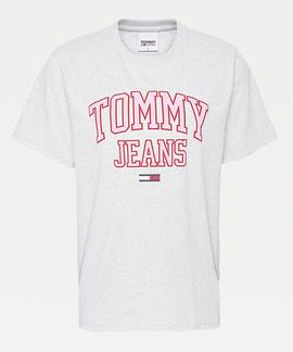 Camiseta Tommy TJW Collegiate Logo Oversized Fit Gris Confeccionada en Algodón con Estampado Frontal Universitario. Cuello Redondo. Manga Corta. Diseñada con una Silueta Extra Relajada con un Bajo Alargado para un Look Deportivo de Gran Tamaño (Oversized).