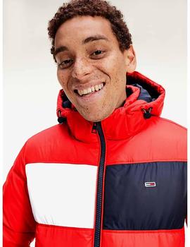 Chaqueta Acolchada Tommy TJM Colorblock Padded Jacket Regular Fit Roja Confeccionada en Nailon Reciclado con Cierre de Cremallera. Capucha Desmontable Mediante Corchetes de Presión y Ajustable con Cordón y Tensores Elásticos. Bolsos Laterales Angulados con Cierre de Botón de Cremallera. Cuello Alto Forrado con Punto Elástico con Estampado de Bandera. Forro Interior de Poliéster Suave y Sedoso Azul Marino. Parche Bordado con el Logo de Tommy Jeans en el Pecho y la Manga Izquierda. Bajo Elástico Fruncido. Relleno Interior de Thermo Fibra. Prenda de Abrigo muy Ligera y Cálida con Buena Impermeabilización y un Gran Aislamiento Térmico, Ideal para esos Fríos Días de Invierno.