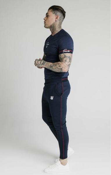 Camiseta SikSilk Raglan Tech Tee Regular Fit Azul Marino Confeccionada en Algodón Elástico de Tacto Suave. Logo Blanco Bordado en el Pecho. Manga Corta Raglan con Cinta Expuesta en Mangas. Cuello Redondo. Bajo Recto. La Talla del Modelo es una M.