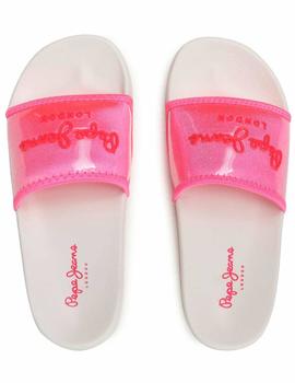 Chanclas Pepe Jeans Slider Crystal de Material Sintético Blanco Combinadas con PVC Rosa de Efecto Cristal con Inscripción de Pepe Jeans al Tono. Base de la Pala con Forma Anatómica Antideslizante. Suela de Goma. Altura Máxima de la Suela 2,5 cm. Altura Total 7 cm.
