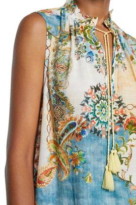 Top Desigual Satiri Regular Fit Confeccionado en Suave Viscosa Multicolor. Cuello Redondo Fruncido con Abertura y Cierre de Cordón. Bajo Ondulado.