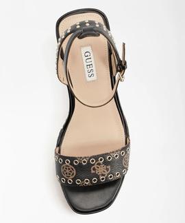 Sandalia Guess Noldo Sandalo Confeccionada en Ecopiel Negra con Estampado 4G (Logo Peonía) y Apliques de Tachuelas Doradas. Cierre de Pulsera en el Tobillo. Plantilla de Piel. Suela de Caucho. Altura del Tacón 9,7 cm. Altura de la Plataforma 3,5 cm.