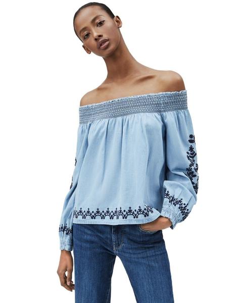 Top Pepe Jeans Hadria Regular Fit Confeccionado en 100% Algodón con Escote Barco Fruncido, Mangas Abullonadas y Bordados Florales Azul Marino.