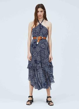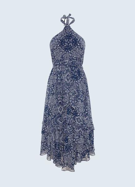 Vestido Midi Pepe Jeans Ramona Azul Marino Confeccionado en un Tejido Vaporoso con Estampado Paisley Blanco. Cierre con Lazada en la Espalda. Cintura Elástica Fruncida. Bajo Irregular con Volantes.