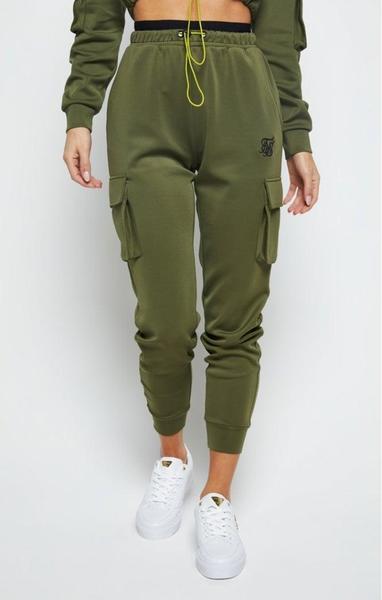 Pantalón Bolso Cargo SikSilk Slim Fit Verde Kaki Confeccionado con Material Sintético Elástico de Tacto Suave como la Seda. Cinturilla con Cordón. Cinturilla Interior Elástica al Contraste. Bolsos Laterales Angulados con Acceso Directo. Logo Negro de SikSilk Bordado en el Muslo Izquierdo. Puños Elásticos al Tono en los Tobillos. La Talla del Modelo es una XS.