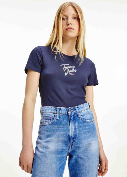 Camiseta Tommy TJW Script Tee Skinny Fit Azul Marino Confeccionada en 100% Algodón Orgánico con Logo Frontal Estampado. Cuello Redondo. Manga Corta.