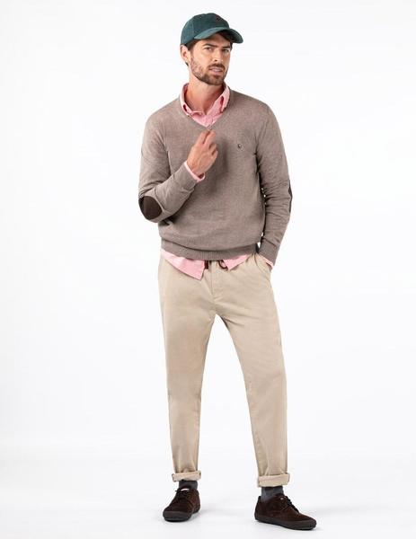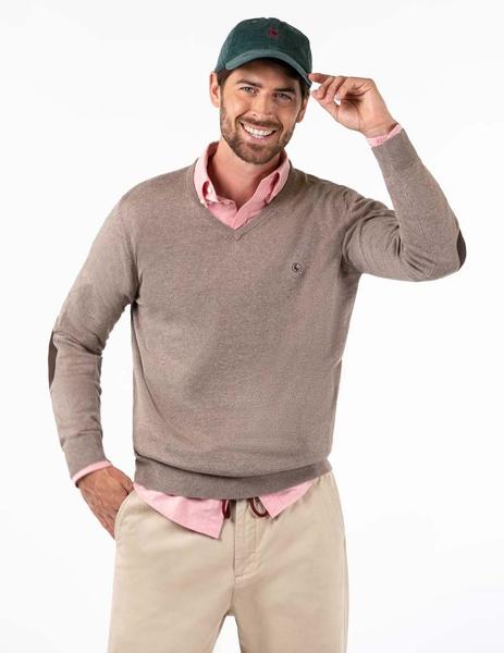 Jersey El Ganso Regular Fit Beige Claro Confeccionado en Mezcla de 95% Algodón Orgánico y 5% Cashmere para un Acabado más Cálido y Suave al Tacto. Cuello de Pico. Manga Larga Acabada en Puño Elástico. Logo Bordado en el Pecho y Coderas de Antelina al Contraste. El Tapacosturas Interior Lleva una Cinta Corbatera de Rayas.