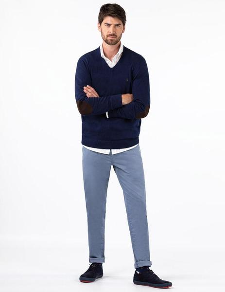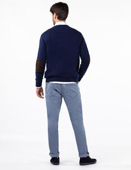 Jersey El Ganso Regular Fit Azul Marino Confeccionado en Mezcla de 95% Algodón Orgánico y 5% Cashmere para un Acabado más Cálido y Suave al Tacto. Cuello de Pico. Manga Larga Acabada en Puño Elástico. Logo Bordado en el Pecho y Coderas de Antelina al Contraste. El Tapacosturas Interior Lleva una Cinta Corbatera de Rayas.