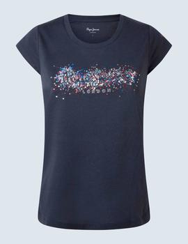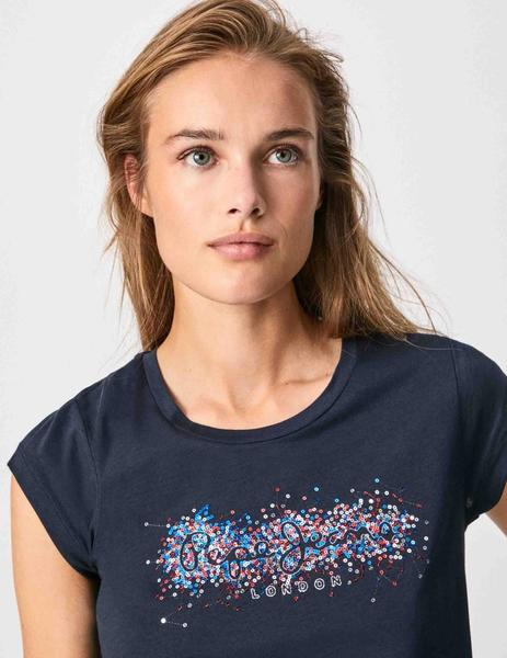 Camiseta Pepe Jeans Berenice Regular Fit Azul Marino Confeccionada en Mezcla de Algodón con Logo Frontal de Pepe Jeans Realizado en Lentejuelas Multicolor Metalizadas e Hilo Lurex Plata. Cuello Redondo. Manga Corta.