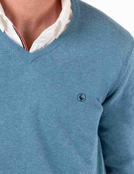 Jersey El Ganso Regular Fit Color Celeste Confeccionado en Mezcla de 95% Algodón Orgánico y 5% Cashmere para un Acabado más Cálido y Suave al Tacto. Cuello de Pico. Manga Larga Acabada en Puño Elástico. Logo Bordado en el Pecho y Coderas de Antelina al Contraste. El Tapacosturas Interior Lleva una Cinta Corbatera de Rayas.