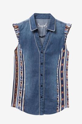 Camisa Vaquera Desigual Naha en Denim Azul con Volantes en las Mangas y Cenefas Laterales.