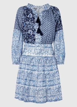 Vestido Pepe Jeans Jess Regular Fit Confeccionado en 100% Algodón con Estampado Floral en Tonos Azules. Cuello Redondo con Abertura en Pico. Detalle de Cordón con Borlas. Corte en Cintura con Nido de Abeja Posterior. Manga Larga Terminada en Puño Elastico. Forro Interior Blanco. Largo Mini.