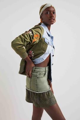 Falda Vaquera Desigual Tropi Regular Fit Verde Kaki Confeccionada en Algodón BCI Elástico con Volante de Tencel Estampado con Print Tropical de Plantas y Guepardos. Estilo 5 Bolsillos. Confeccionado en Algodón Sostenible. Los Tejidos de Algodón BCI Aseguran un Uso Responsable del Algodón: Una Producción Mejor para las Personas que lo Producen, Mejor para el Medio Ambiente en el que Crece y Mejor para el Mundo. TENCEL o LYOCELL (Es una Tela Lisa y Suave de Tacto Agradable que Apenas Arruga con muy Buena Transpiración y Propiedades Antibacterianas).