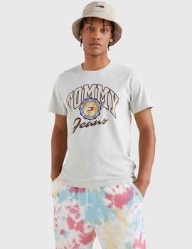 Camiseta Tommy TJM Bold College Tee Regular Fit Gris Confeccionada en 100% Algodón Orgánico con Estampado Frontal de Estilo Universitario de Tommy Jeans. Manga Corta. Cuello Redondo. Parche con Logo de Tommy Jeans en la Manga.