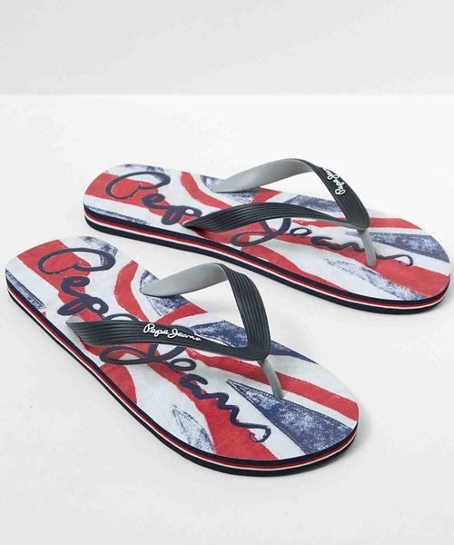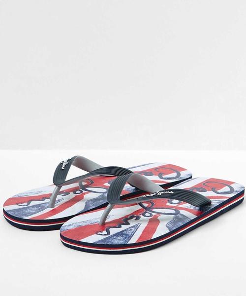 Chanclas Pepe Jeans Hawi Union Confeccionadas en Material Sintético. Base Antideslizante con Logo de la Marca y Estampado de Bandera. Tiras de la Chancla de Goma Azul Marino con Logo al Contraste. Altura de la Suela 2 cm. Altura Total 6 cm.