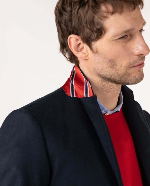 Americana El Ganso Slim Fit Azul Marino Confeccionada con Tejido Panamá en 100% Algodón Sostenible BCI. Cuello con Solapa y Cierre con Botones. Manga Larga terminada en Puño Abotonado. Bolsillos de Solapa y de Pecho. Cuenta con Detalles en Tejido Corbatero Rojo con Rayas Azules y Blancas así como Coderas de Ante Marrón. Los Tejidos de Algodón BCI Aseguran un Uso Responsable del Algodón: Una Producción Mejor para las Personas que lo Producen, Mejor para el Medio Ambiente en el que Crece y Mejor para el Mundo.