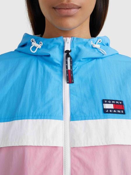 Chaqueta Cortavientos Tommy Chicago Colorblock Regular Fit Celeste y Rosa Confeccionada en 100% Nailon Reciclado con Cierre de Cremallera. Capucha Fija Regulable con Tensores Elásticos. Logo de Tommy Jeans Bordado en Relieve en el Pecho. Bolsos Laterales Angulados con Cierre de Cremallera. Forro Interior de Suave Poliéster en Rejilla al Tono. Bajo Recto Ajustable con Tensores Elásticos Laterales. Puños Elásticos. Añade un Toque Deportivo a tus Looks con este Cortavientos, que Destaca por el Alegre Diseño Color Block y el Emblemático Parche de Tommy.