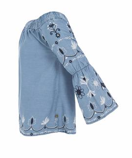 Top Pepe Jeans Hope en Denim Azul con Bordados, Mangas Acampanadas y Escote Barco.