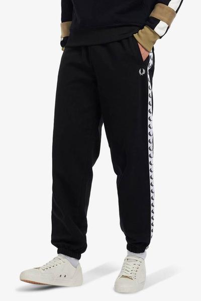 Pantalón Deportivo Fred Perry Taped Track Pant Regular Fit Negro Confeccionado en Tejido Tricot Brillante con Cintura Elástica al Tono y Cordones Ajustables. Logo Bordado en el Muslo Izquierdo. Cinta Lateral al Contraste con Estampado Laurel Wreath (Corona de Laurel). Bolsos Laterales Angulados. Bajo con Puño Elástico. Diseño Inspirado en la Ropa Deportiva de los 90.