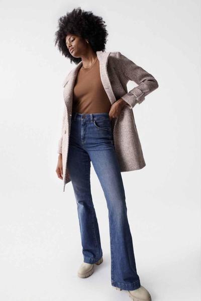 Abrigo Salsa Slim Fit Rosa y Blanco Confeccionado en Paño con Textura de Espiga y Cierre Cruzado con Doble Botonadura. Cuello Alto con Dos Botones. Bolsos con Cierre de Cremallera Vertical en la Zona del Pecho. Bolsos Laterales Angulados. Manga Larga con Trabilla. Ribete de Ecopiel en los Bolsillos Laterales y en los Hombros. Forro Interior de Poliéster al Tono con Estampado de Letras.