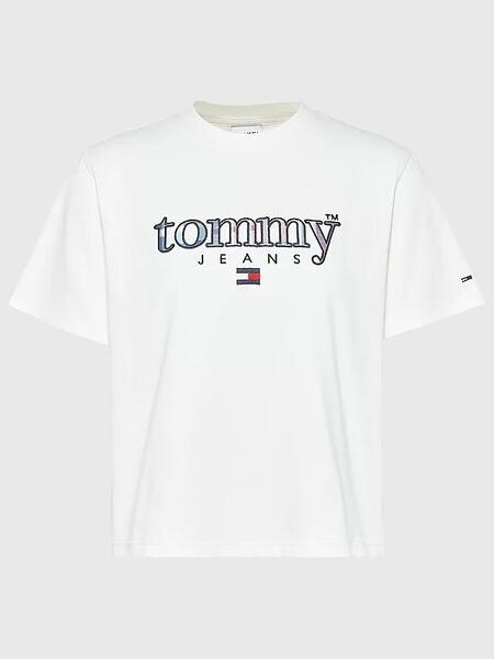 Camiseta Tommy Regular Fit Color Crudo Confeccionada en Puro Algodón Orgánico con Logo Frontal de Tommy Bordado con Estampado de Cuadros Multicolor. Cuello Redondo. Manga Corta. Detalles Distintivos de Tommy Jeans. Patronaje Amplio y Holgado, Ligéramente Caída de Hombros.