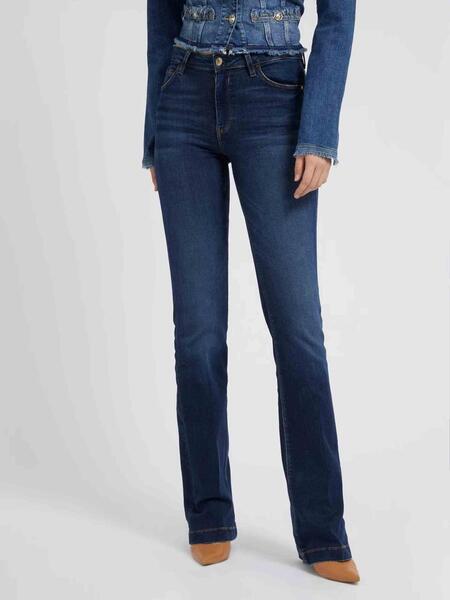 Pantalón Vaquero Guess Sexy Bootcut Confeccionado en Denim Elástico Azul Degradé con Cierre de Cremallera. Tiro Medio. Estilo 5 Bolsillos. Pierna Ligeramente Acampanada (Bootcut). Logo de Guess Triangular en el Bolso Trasero. Corte Ajustado hasta la Rodilla, Acabando en una Ligera Campana. Reborn Denim (Denim Ultra Suave Realizado con Fibras de Algodón Reciclado). Longitud de Entrepierna de 32 pulgadas. / 81,3 cm. La Imagen Muestra una Talla 27.