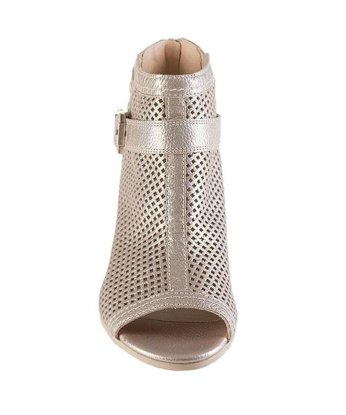 Sandalias NeroGiardini P805142D 672 de Piel Dorada Metalizada con Hebilla Plata y Piel Perforada. Altura Tacón 5,5 cm. SE RECOMIENDA ESCOGER UNA TALLA MENOR A LA HABITUAL.