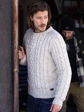Jersey Petrol Grayslake Regular Fit Confeccionado en Suave Punto con Textura Trenzada en Color Crudo y Gris Jaspeado, con Mezcla de Algodón. Cuello Redondo. Parche de Petrol en el Bajo. Cuello, Puños y Bajo Acanalados.