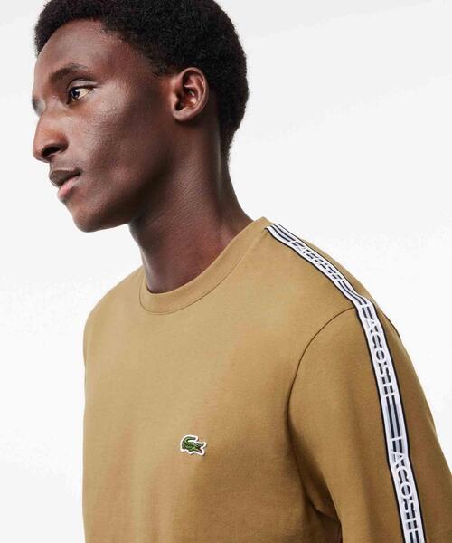 Camiseta Lacoste Regular Fit Camel Confeccionada en Puro Algodón con Cinta Deportiva en los Hombros y en la Manga con Inscripción de la Marca. Cuello Redondo. Cocodrilo Verde Bordado en el Pecho. Manga Corta.